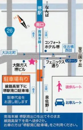 ※お車でお越しの方は、高架下にある「堺駅南口駐車場(医院から徒歩1分)」をご利用ください。90分(450円)までは、こちらで負担させていただきます。駐車券をお持ちください。