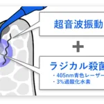 このラジカル殺菌を、超音波振動と同時に歯周ポケット内部で作用させることで、従来よりも効率的に歯周病菌を除去することができます。